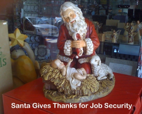 Wandering through a Christian bookstore last week, I discovered amid the stacks of Bibles and discounted Dr. Oz books this foot-high ceramic centerpiece. A truly weird clash of universes—the blissful religiosity of Jesus in a manger, and Santa Claus, the patron saint of-